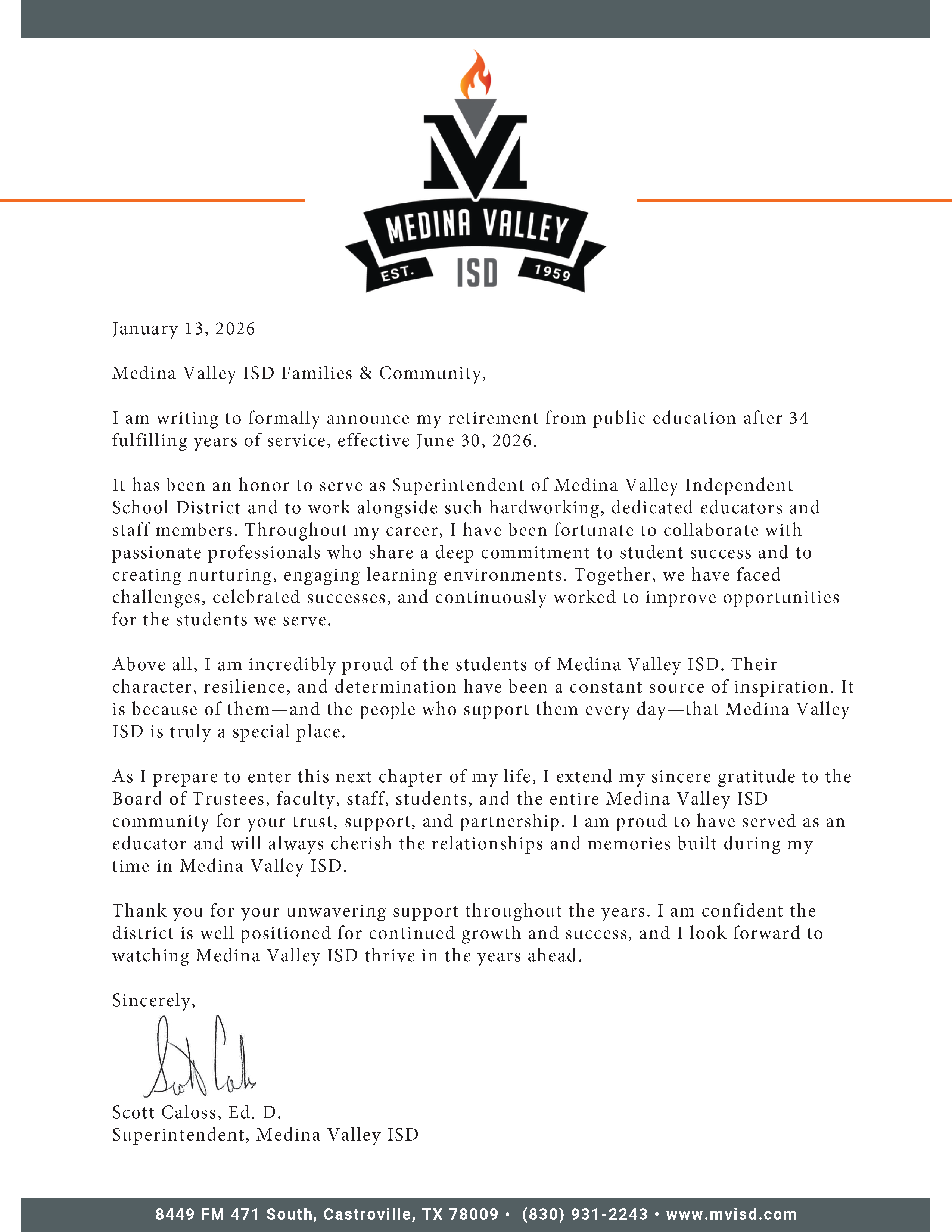 On behalf of the Medina Valley ISD Board of Trustees, we would like to acknowledge Superintendent Dr. Scott Caloss’s recent announcement regarding his retirement, effective June 30, 2026.